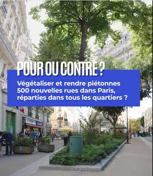 La question exacte qui sera posée est :"POUR OU CONTRE végétaliser et rendre piétonnes 500 nouvelles rues dans Paris, réparties dans tous les quartiers ?"