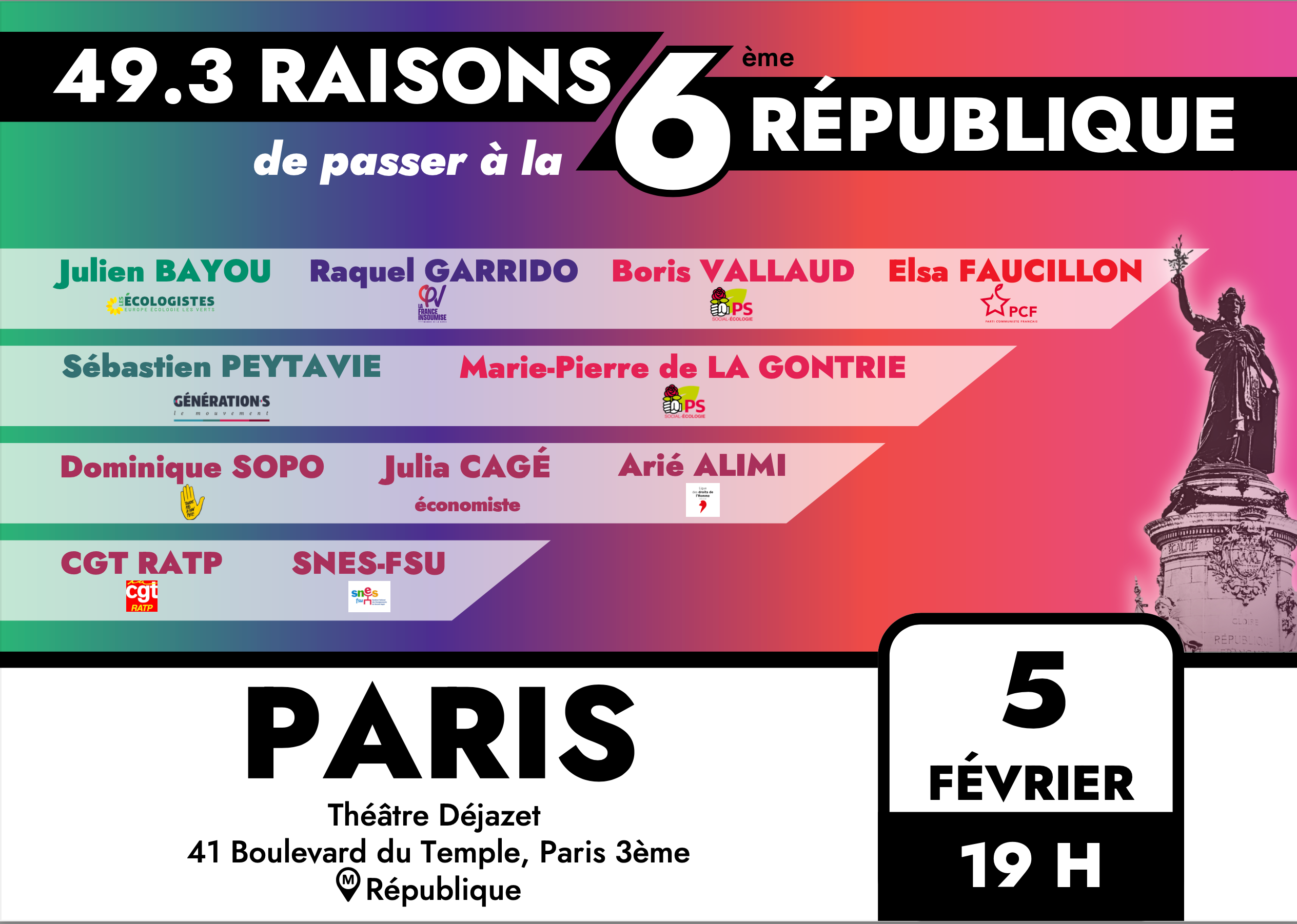 Ce lundi 5 février, le théâtre Déjazet accueille une soirée-débat sur le passage à une 6ème république. Un débat avec des syndicats et les autres formations de gauche.