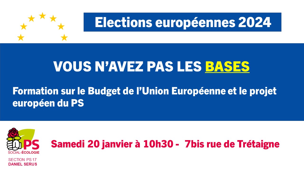 A quelques mois de cette belle échéance, la section PS du 17e vous propose de réviser ensemble les fondamentaux avec un temps de formation sur l'Union Européenne, qui reviendra sur les mécanismes du Budget Européen ainsi que sur les points clés à retenir du programme du PS pour le scrutin du 9 juin 2024.