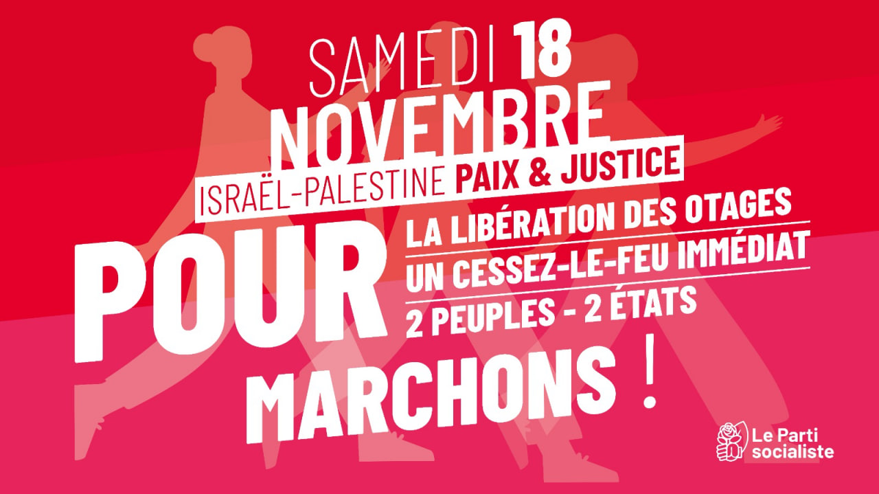 Face à la situation grave au Proche Orient, le Parti socialiste, avec plusieurs organisations de gauche, appelle à se mobiliser samedi 18 novembre, pour la libération des otages, pour un cessez-le-feu immédiat et pour une solution à 2 États !