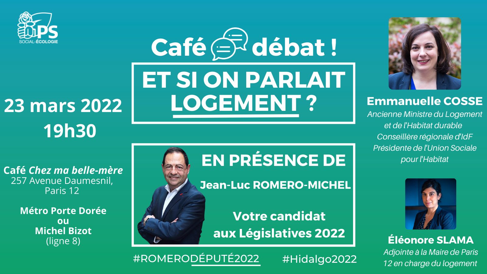 Dans le cadre de la campagne présidentielle d'Anne Hidalgo dans le 12e arrondissement et de la campagne de Jean-Luc Romero-Michel dans la 8e circonscription de Paris, retrouvons-nous pour un café politique sur le logement ce mercredi 23 mars à 19h30 au café Chez ma belle-mère (257, avenue Daumesnil) en présence d'Emmanuelle Cosse, ancienne Ministre du logement et de l'Habitat durable, Présidente de l'Union Sociale pour l'Habitat.